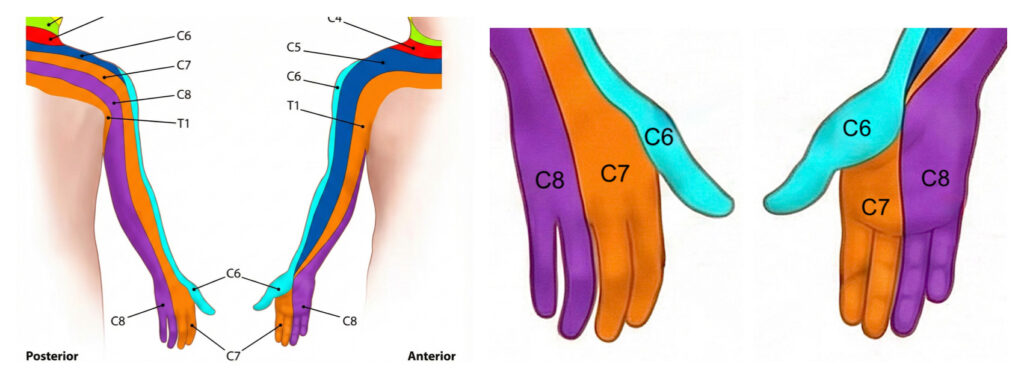 Each nerve root supplies a certain area of the arm with sensation. The area supplied by a nerve root is called its ‘dermatome’. The most common nerves affected by cervical radiculogpthy are the C6, 7 and C8 nerve roots, which are the ones whose dermatomes supply the hand. Hand and finger pain / tingling is a common symptom when these nerve root are irritated.